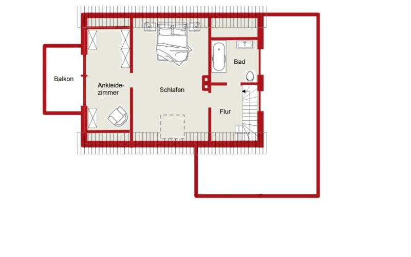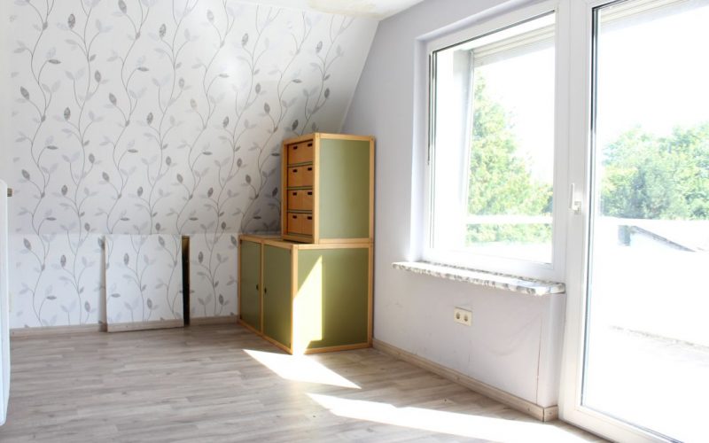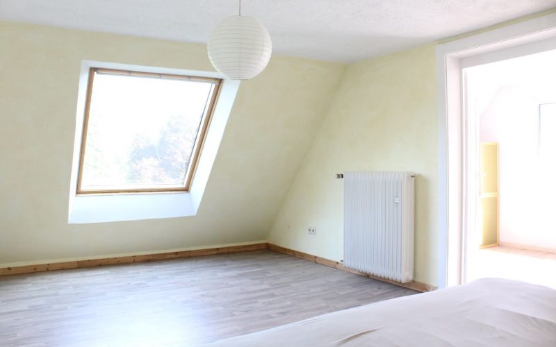 Eine Treppe mit massiven Eichenstufen führt in die obere Etage, welche mit einem separaten Bad und einem lichtdurchfluteten Schlafzimmer überzeugt. Ein weiteres angrenzendes Zimmer kann als Ankleidebereich oder Kinderzimmer genutzt werden. Ein nach Süden ausgerichteter Balkon bildet hier den Abschluss mit einem malerischen Ausblick ins Leinetal.