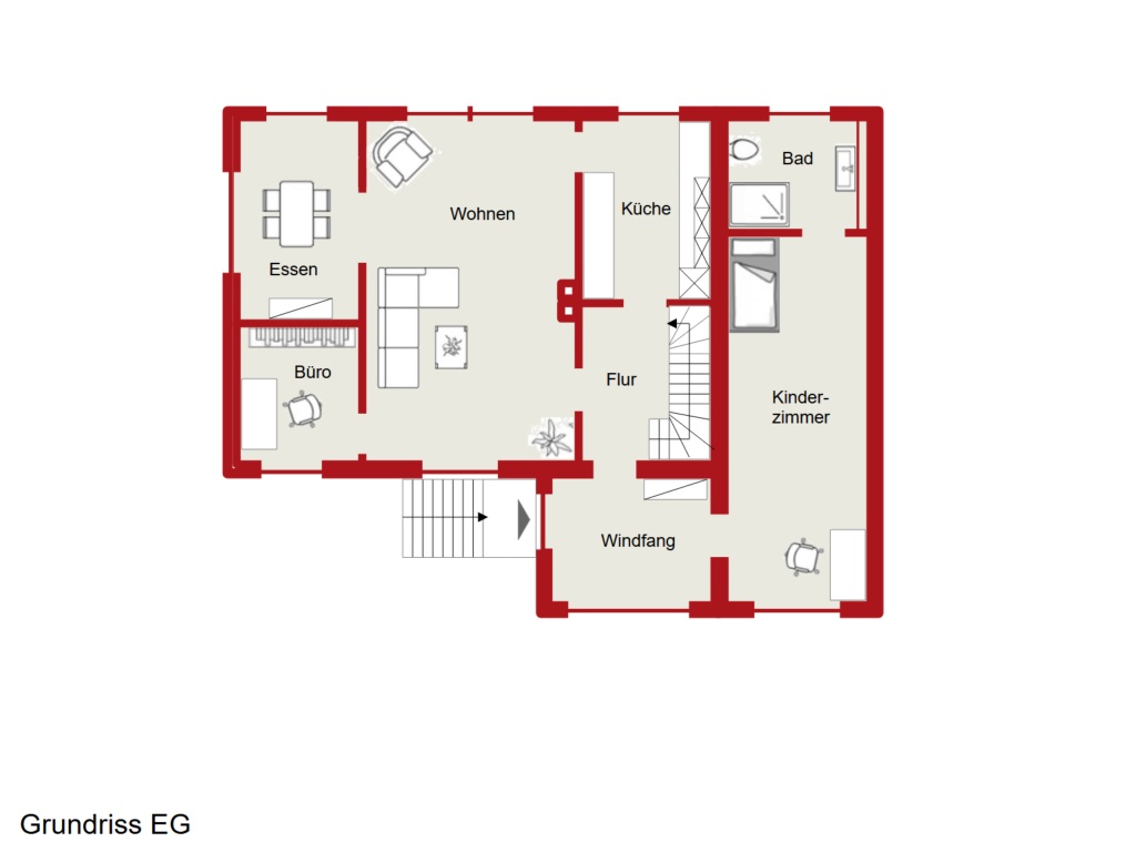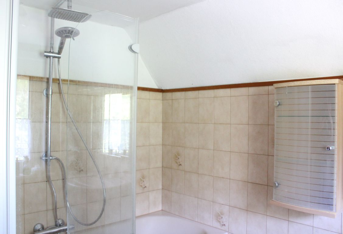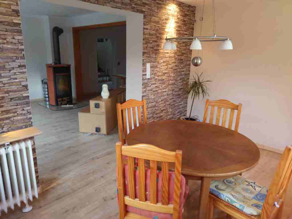 Das massiv erbaute Haus bietet auf zwei Etagen diverse Möglichkeiten, ihm einen eigenen Charakter zu verleihen und es nach individuellen Wünschen zu gestalten. Ein großzügiges Wohnzimmer mit fließenden Übergängen zum einladenden Esszimmer und zur Küche bilden das Herzstück des Erdgeschosses. Im Wohnzimmer wartet ein angeschlossener Kaminofen besonders an kühlen Abenden darauf, Ihnen das Gefühl von wohliger Geborgenheit zu vermitteln. Auf dieser Etage wurde außerdem ein modernes Bad mit großer bodentiefer Dusche geschaffen. Ein separater Raum für ungestörtes Home-Office und ein weiteres Zimmer runden das gute Platzangebot auf dieser Etage ab.