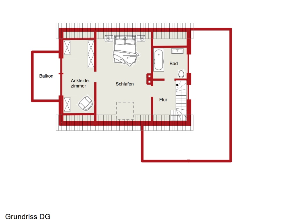 Eine Treppe mit massiven Eichenstufen führt in die obere Etage, welche mit einem separaten Bad und einem lichtdurchfluteten Schlafzimmer überzeugt. Ein weiteres angrenzendes Zimmer kann als Ankleidebereich oder Kinderzimmer genutzt werden. Ein nach Süden ausgerichteter Balkon bildet hier den Abschluss mit einem malerischen Ausblick ins Leinetal.