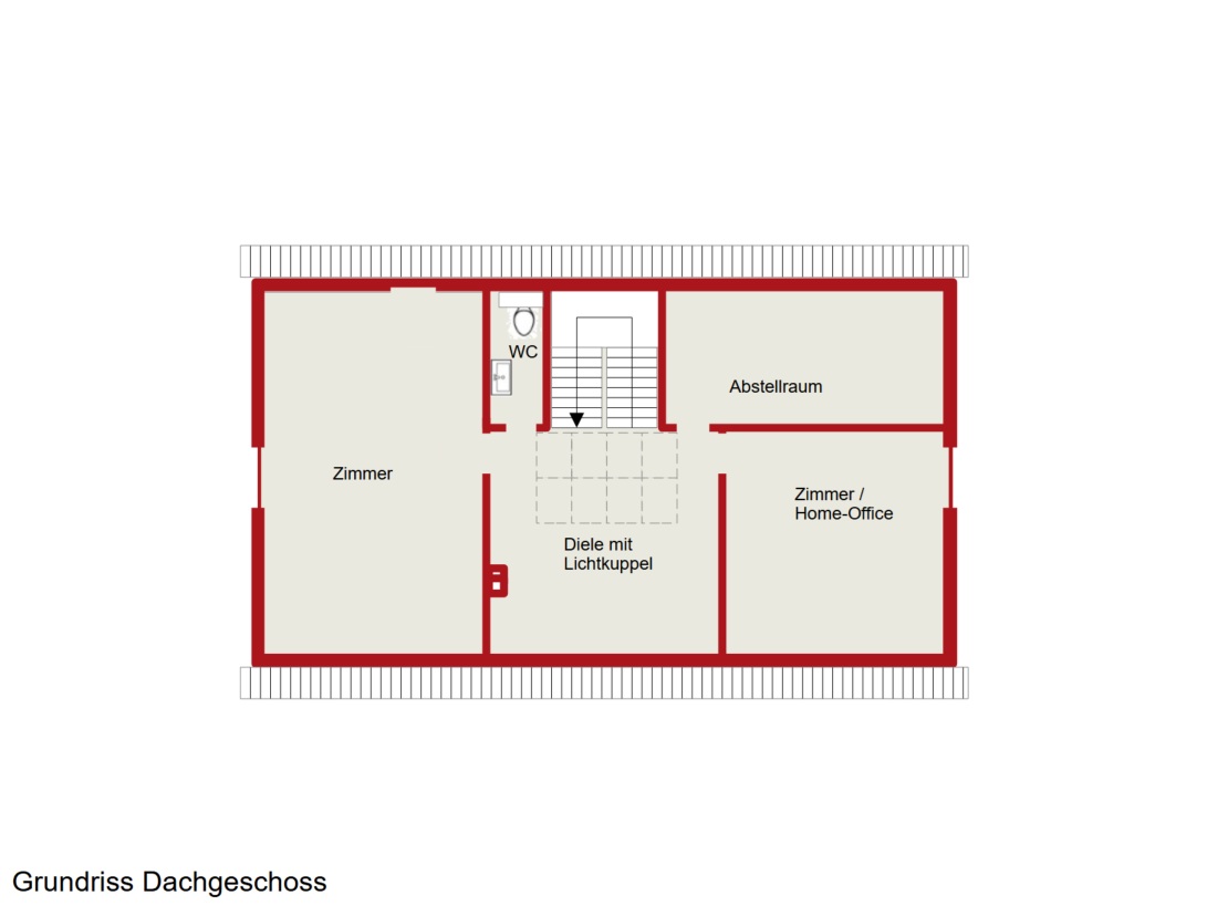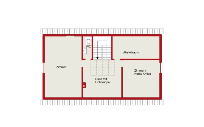 Auch im Dachgeschoss gibt es viel Licht! Das Architekturbüro hat hier eine Lichtkuppel entlang des Firsts einbauen lassen, dadurch ist immer genügend Licht vorhanden und falls es mal zu hell ist, kann der Raum ebenfalls verdunkelt werden. Ferner befinden sich im Dachgeschoss zwei weitere Zimmer von angenehmer Größe, welche den Raum bis unter die Dachschrägen ausnutzen.
