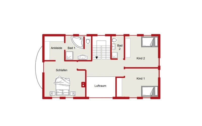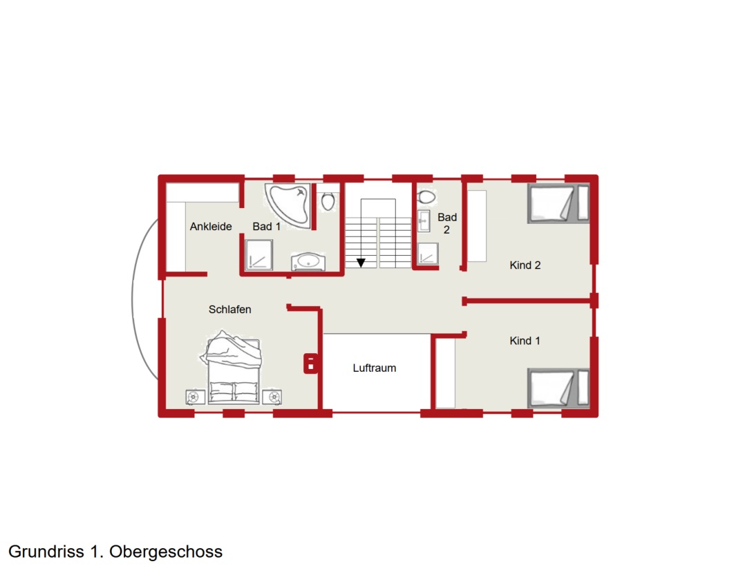 Das 1. Obergeschoss beheimatet drei Schlafzimmer, welche alle von der Galerie aus erreicht werden. Auf dieser Etage gibt es keine Dachschrägen. Es gibt zwei Kinderzimmer und daneben ein Dusch-Bad. Des Weiteren befindet sich auf dieser Etage ein großes Schlafzimmer mit Bad en Suite und begehbarem Kleiderschrank. Dieses Badezimmer bietet neben einer Dusche auch eine schöne Eck-Badewanne, die zum Relaxen einlädt. Selbstverständlich alles mit Tageslicht.